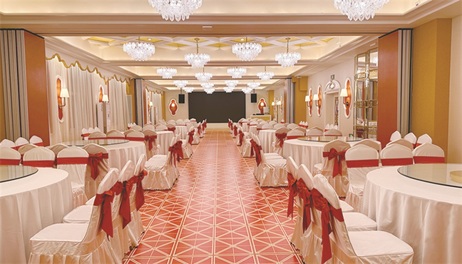 鉑金大廳—色彩濃烈,現代式裝修,面積560㎡,層高6米,開合大屏配合舞美燈光,唯美震撼,可承接30桌的中型宴會;12米長的可移動T臺收起后,就變成了可容納400人同時落座的大型多功能會議室。